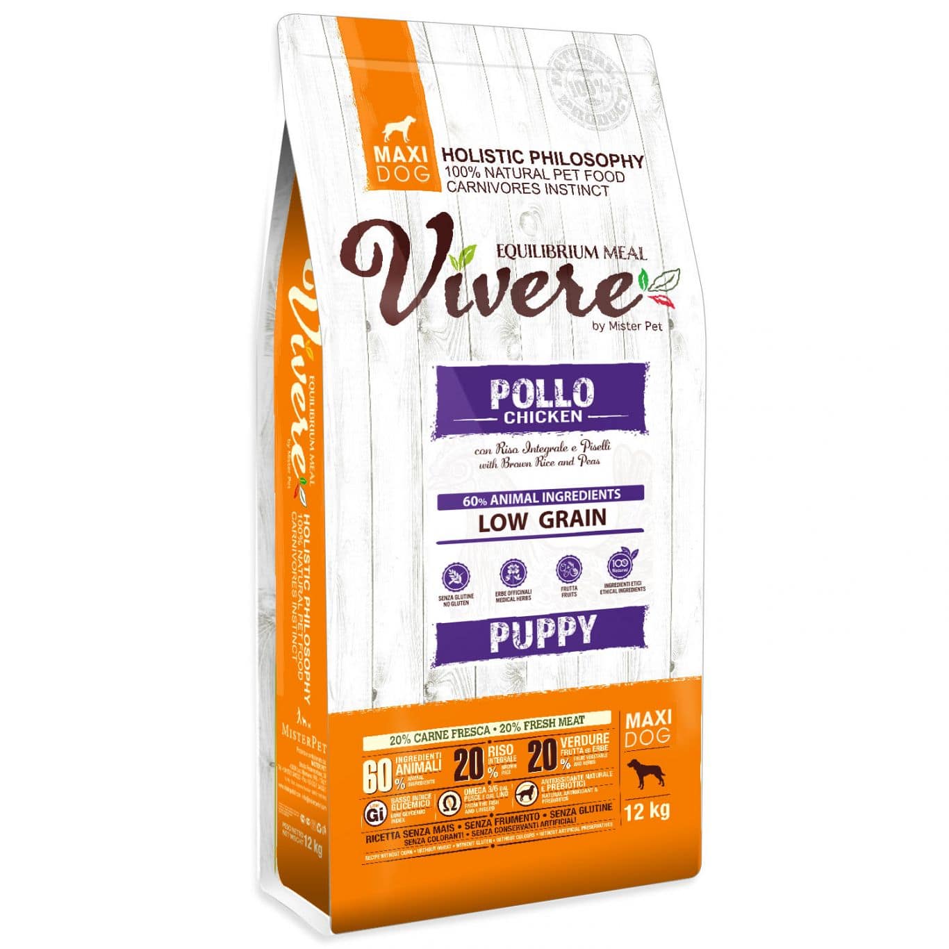 Vivere Low Grain Maxi Puppy on loodud kutsikatele, kes täiskasvanutena kaaluvad üle 25 kg. Toit sisaldab kuivatatud ja värsket kondita kanaliha ning kuivatatud tervet lõhet. Suurt tõugu kutsikad vajavad valgurikast toitu, kus on rasv ja valk tasakaalus, et tagada piisav energiavarustus ja ühtlane kasv.